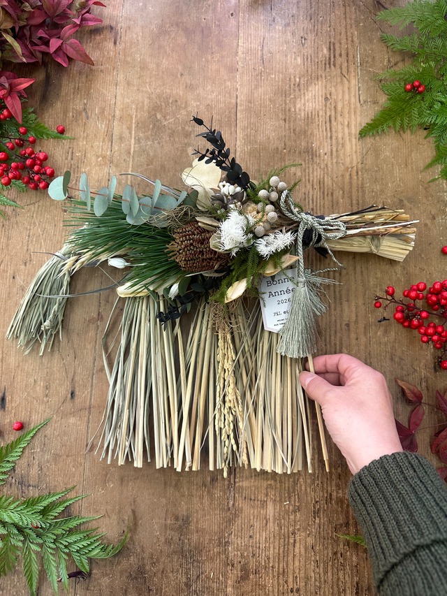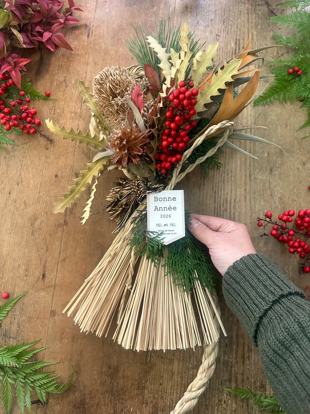 FiL et FiL がセレクトしてお届けする”2026 注連縄” こちらはフレッシュの松やヒバにドライフラワーや木の実を使用した注連縄です。 お家の扉はもちろん、お部屋の中にも飾りやすいサイズです。 お歳暮としての贈り物にも喜ばれており、特別な日の演出に最適です。 華やかさと温かみを持ち合わせたこの注連縄は、季節感を取り入れた飾りつけにも最適で、皆様の大切な空間を彩ります。 新年の訪れを感じさせる存在感は、贈る方にも贈られる方にも喜ばれることでしょう。 サイズ:約 H35cm × W30cm *商品を店頭にて受け取り希望の場合は、ネットショップでの注文をせず、メール[email protected]にてお取り置きのご連絡をお願いいたします。 店舗にてお渡しさせていただきますので、事前のご予約をお願い致します。 (ネットショップでお手続きいただきますと、決済時に配送代が含まれてしまいますのでご注意ください) *お届け先が複数の場合、1件ずつご注文を完了させてください。 *お届け時にご不在が続く場合、商品は2日ほどで店頭に戻るシステムとなります。できるだけ在宅されていることをご確認の上、ご注文ください。再度お送りする場合、送料のご負担をいただくことになりますので、ご了承ください。 お届けはご注文受付後、順次発送いたします。 到着までに2−3日程お時間を頂きます (日時指定がある場合、ご注文後3日以降の日程を備考欄にてお知らせ下さい)