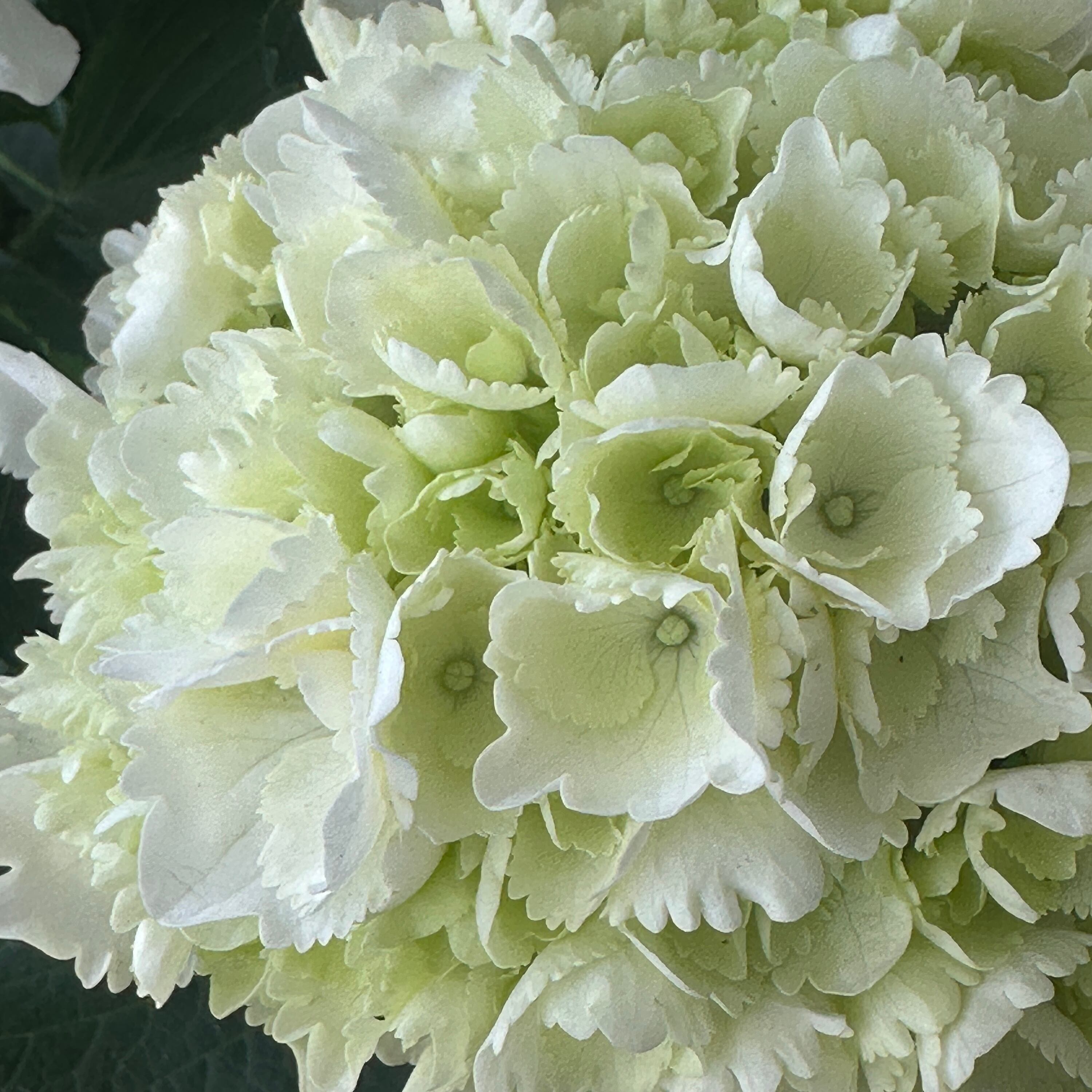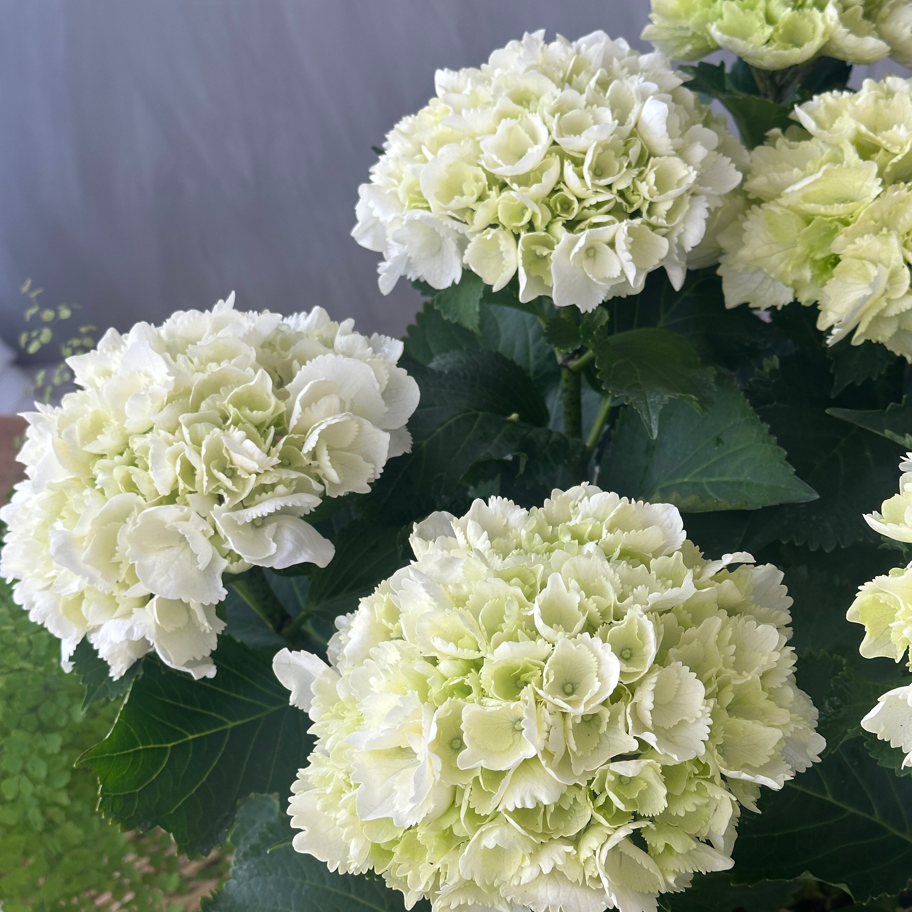 オランダで作出された西洋アジサイの人気の品種です。砂糖菓子のような純白のテマリ咲きで、フリル状の細かい切れ込みが入るフリンジ咲きが特徴です。花が咲き進むにつれ、純白から次第に淡いグリーンへと色変わりする様子も楽しめます